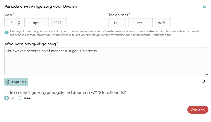 - Vul de begin en eind datum in van de onvrijwillige zorg. En vul het veld 'Afbouwen onvrijwillige zorg'. Geef tevens aan of het plan goedgekeurd is door de WZD functionaris.