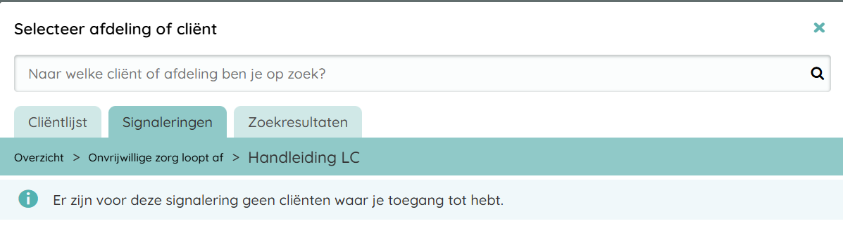 - Indien je een signalering selecteerd waar geen cliënten onder vallen of cliënten waar je geen toegang tot hebt, dan krijg je daar een melding van.