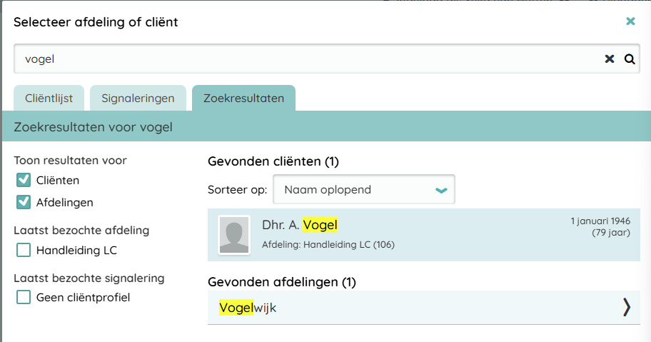 - Terwijl je typt opent hij vanzelf het tabblad met zoekresultaten. Geef aan of je de resulaten van cliënten of van afdelingen wilt zien. Door het vinkje aan of uit te zetten bij 'Toon resultaten voor':'cliënten''afdelingen'