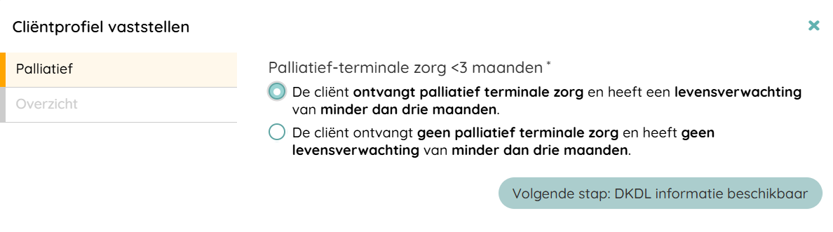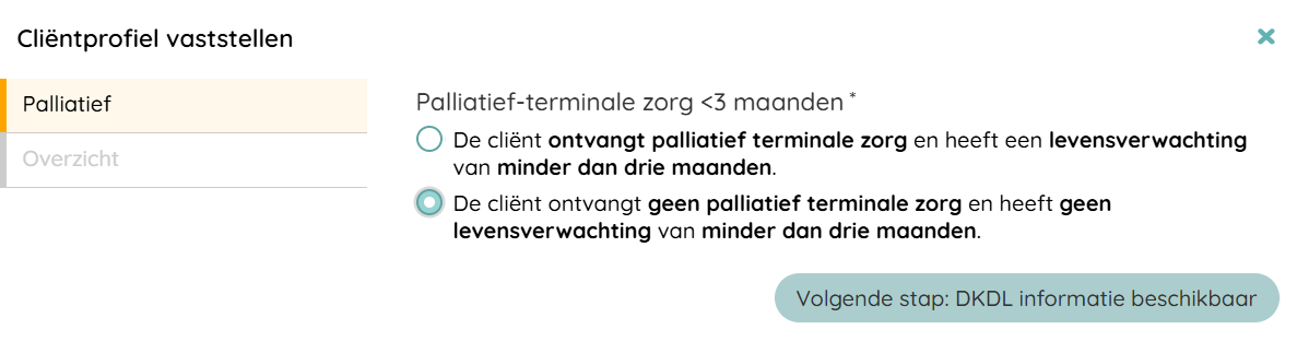 - Hier is de bovenste keuze 'De cliënt onvangt palliatieve terminale zorg...' aangevinkt bij 'palliatief'. klik op 'Volgende stap: DKDL informatie beschikbaar'