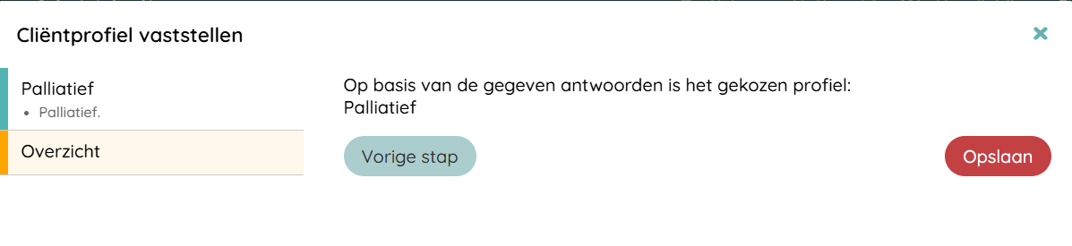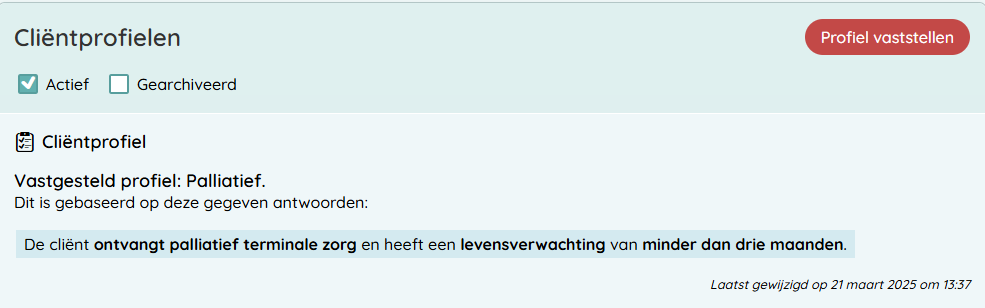 - Als je een nieuw Cliëntprofiel aanmaakt. In dit voorbeeld die van palliatieve zorg, dan wordt het oude Cliëntprofiel automatisch gearchiveerd.