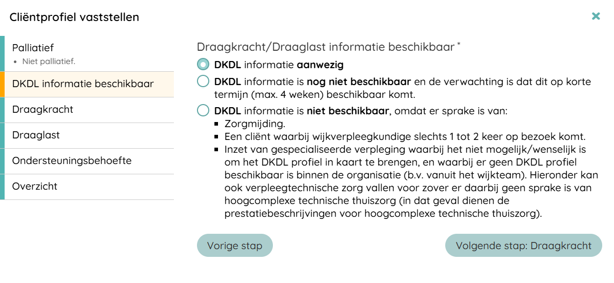 - Maak een keuze bij 'palliatief' En klik op 'Volgende stap: DKDL informatie beschikbaar'