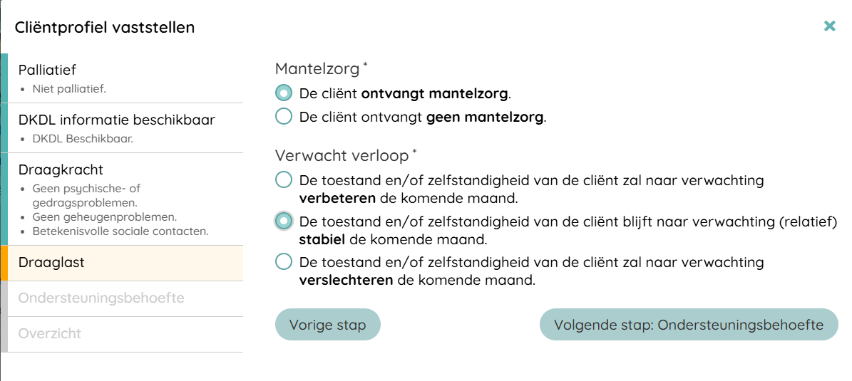 - Geef de draaglast aan.En klik op 'Volgende stap: Ondersteuningsbehoefte'