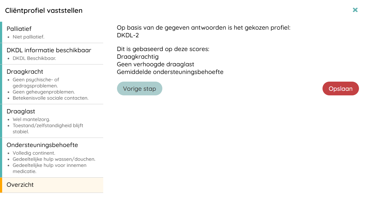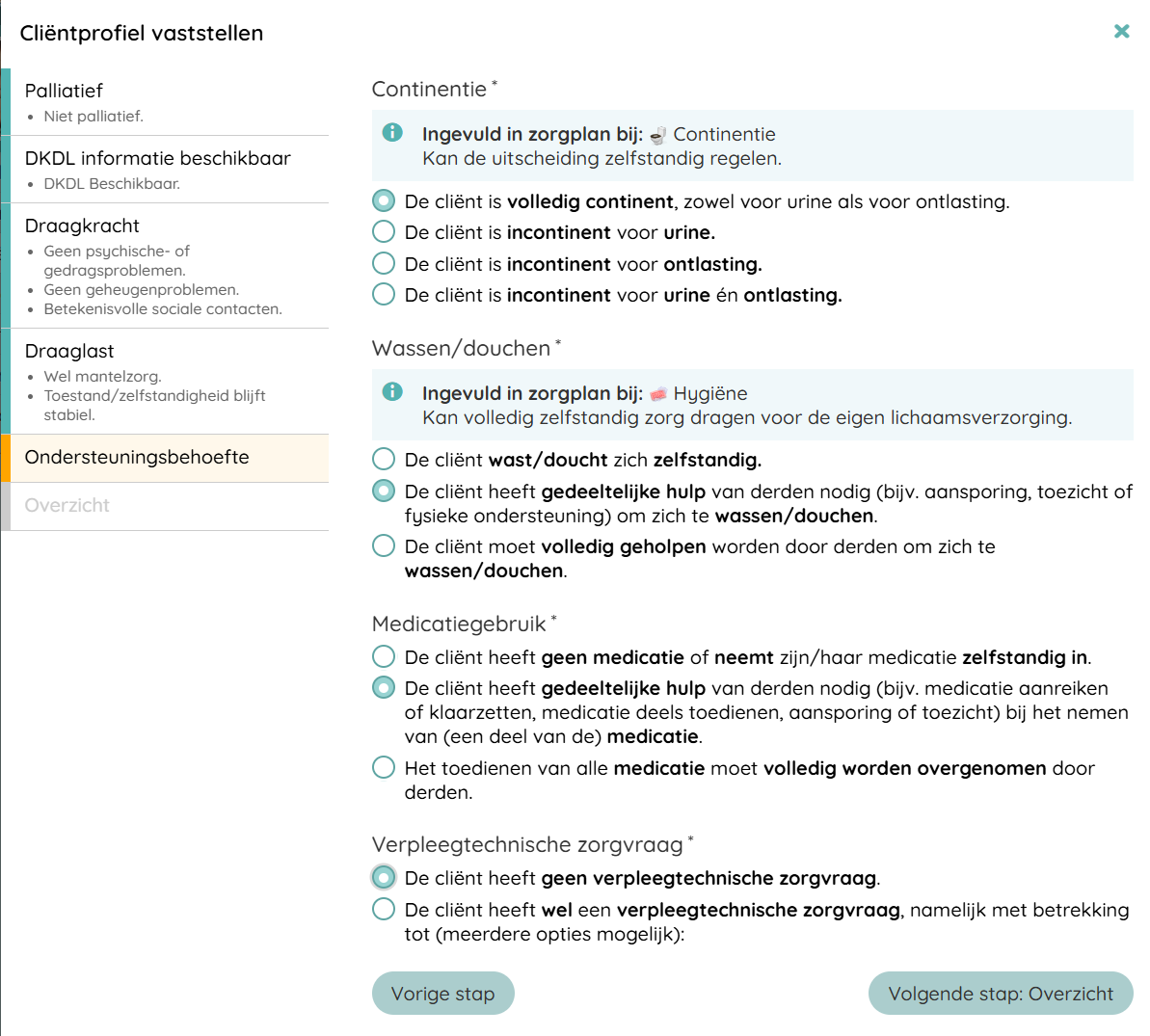 - Geef aan of en waar de cliënt ondersteuning bij nodig heeft. En klik op 'Volgende stap: Overzicht'