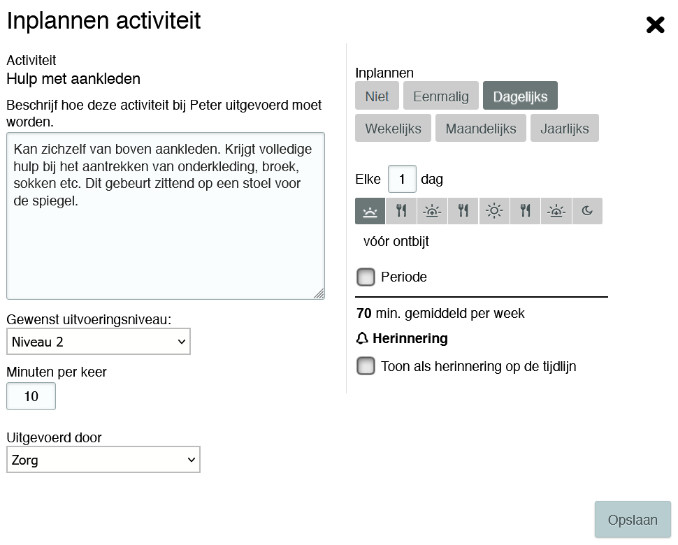 - Geef aan op welk deel van de dag de activiteit plaatsvindt. Als dit correct en consequent ingevuld is dan werkt het overzicht onder de Tegel 'Activiteiten' optimaal.