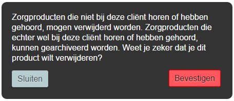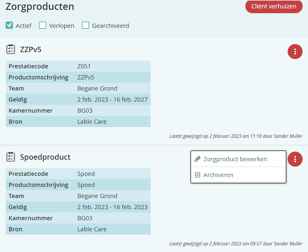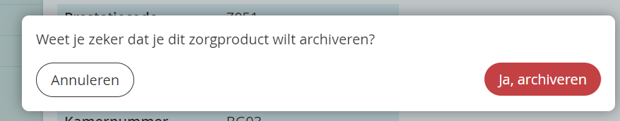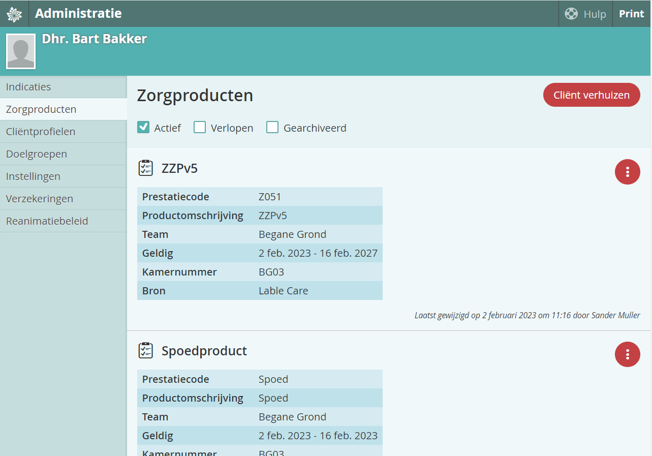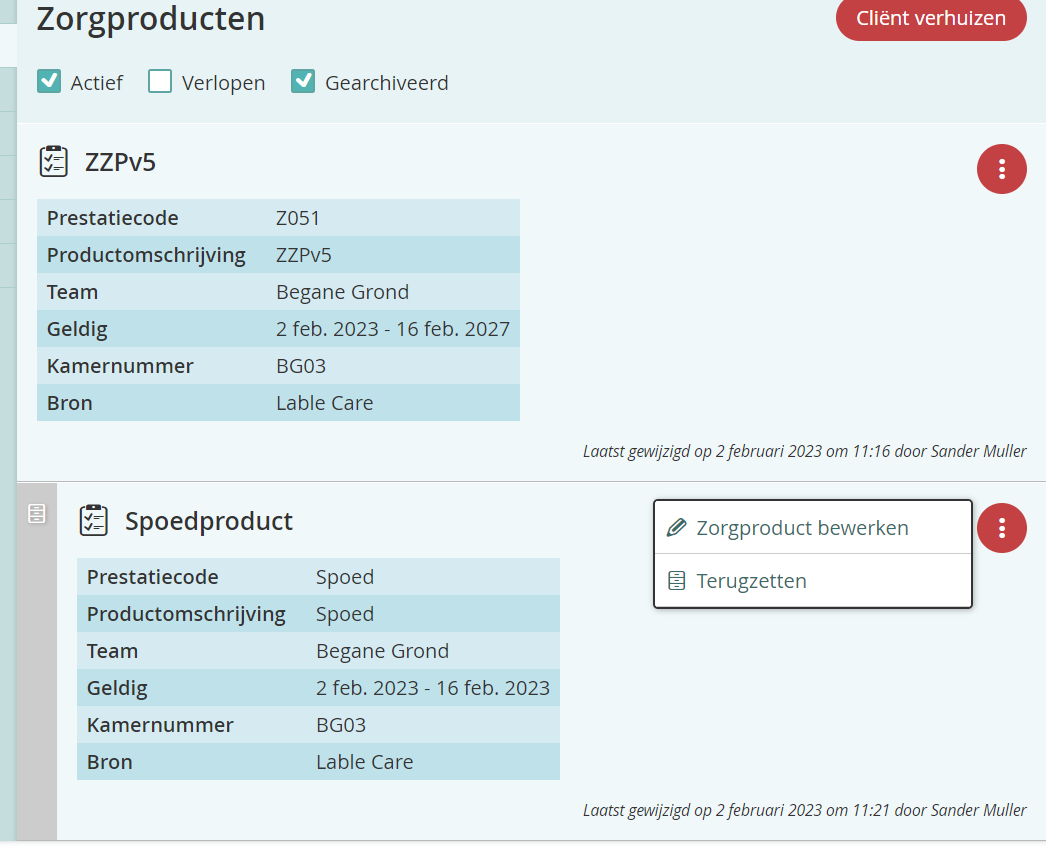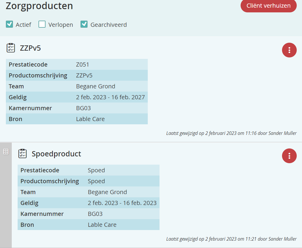 Geen standaard functionaliteit: alleen voor gebruikers waarvan de zorgorganisatie Lable gevraagd heeft deze functionaliteit te activeren.Onder de tegel 'Administratie' kun je zorgproducten archiveren. Verhuizingen zijn in Lable Care te bewerken, maar de zorgproducten via de koppeling niet. Doordat de koppeling meestal automatisch draait bestaat de kans dat er incidenteel een fout zorgproduct is toegevoegd in Lable Care. Middels deze functionaliteit kan een organisatie zelf het zorgproduct 'archiveren'. Hierdoor wordt een cliënt niet meer getoond op de locatie van het gearchiveerde zorgproduct.